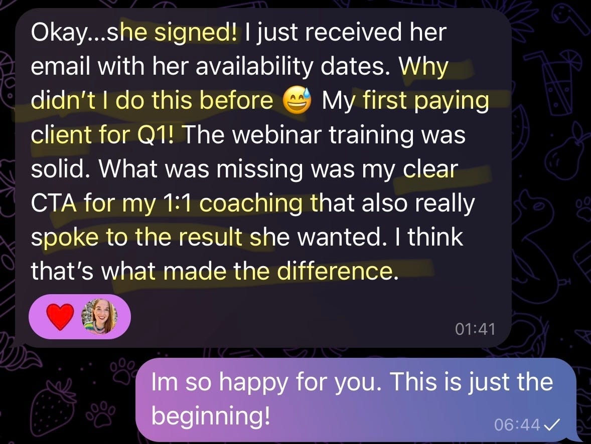 We recently ran her offer through this exact 3 part equation and she went from being low key ghosted, to signing her first client this year. As you can see in the message below ⬇️